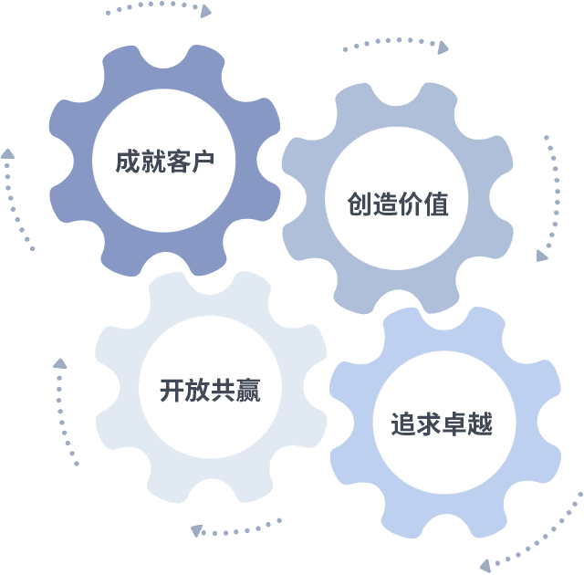 成就客户是一切决策的出发点,,,创造价值是衡量所有工作的标准,,,,追求卓越是我们做事做人的态度,,,,开放共赢是我们的格局也是最终的结果。。价值观的齿轮环环相扣,,,,推动着组织里的每个人不断向前。。。