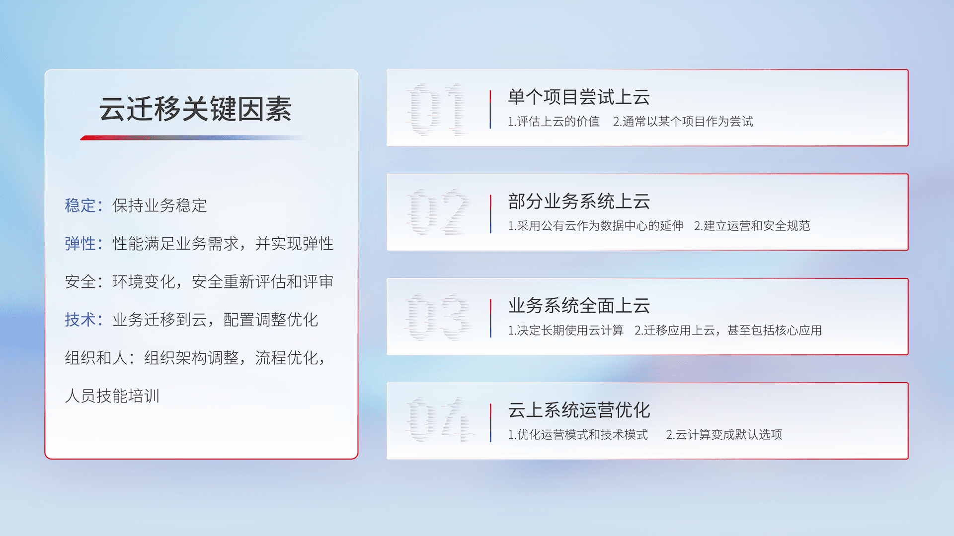 结合实际业务,,,,从规划设计、、、云平台选型、、云原生改造、、数据迁移、、、、集成交付,,,,迁移全过程为客户识别最佳上云路径,,,做好风险识别管理,,,设计网络架构、、、身份权限、、、、安全审计合规、、操作审计、、日志审计、、监控告警策略、、、多站点容灾设计等,,,对云上基础设施进行整体规划,,,提升IT治理水平,,以满足弹性、、高可用、、、、高性能的需求。。。