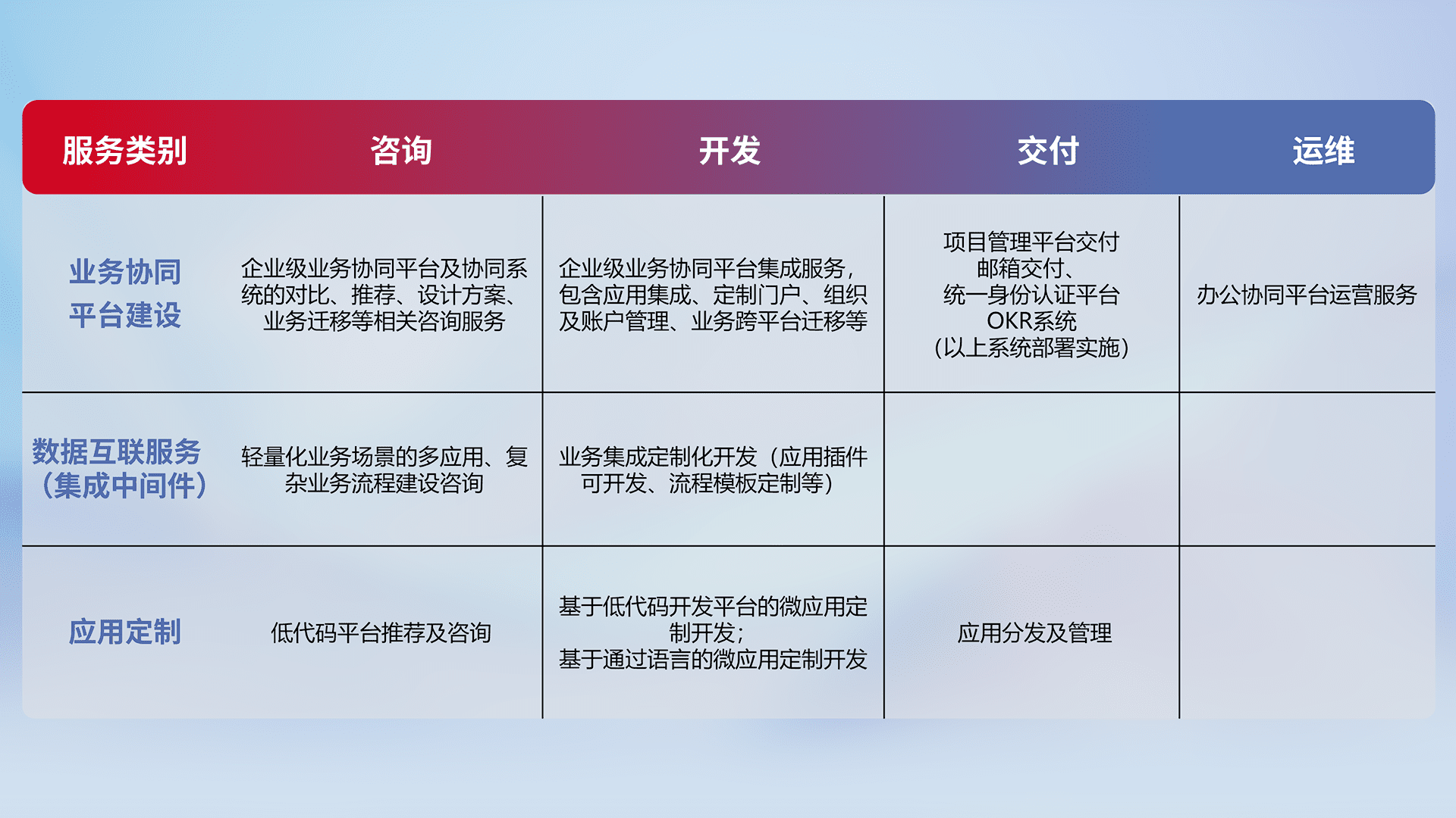 针对钉钉、、、企微、、、、IDaas等平台级产品提供产品的规划、、、、方案、、交付、、、、定制化开发等服务,,,,实现如统一协同办公、、智能客户服务、、混合会议管理、、、智能数据查询、、、等业务场景,,实现数字化转型。。。。